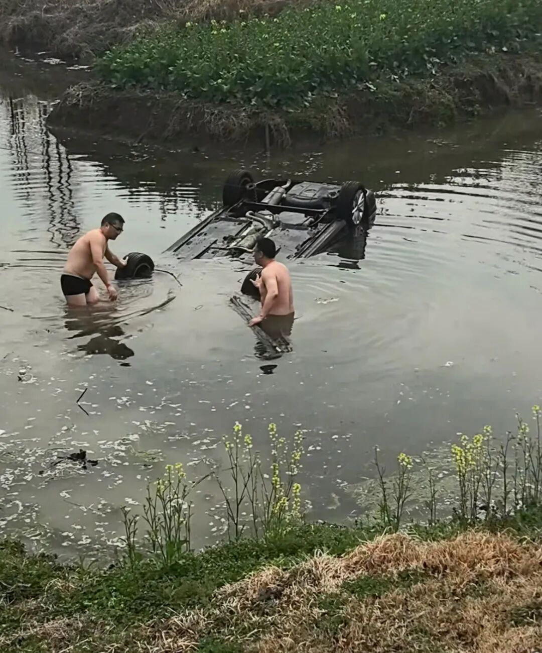 一开始有人脱衣服下水,发现没办法救人,于是他们找来两根绳子系住两个轮胎,十来个人合力将车子翻了过来,将人从驾驶舱拉出来的时候,“脸已经白掉了”。