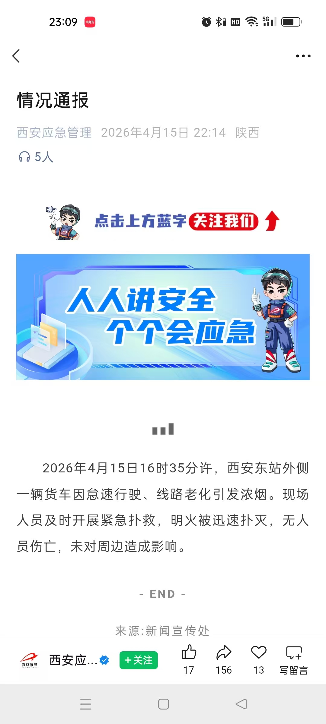 15日22时14分,“西安应急管理”官方账号发布情况通报:2026年4月15日16时35分许,西安东站外侧一辆货车因怠速行驶、线路老化引发浓烟。现场人员迅速开展紧急扑救,明火已扑灭,无人员伤亡,未对周边造成影响。