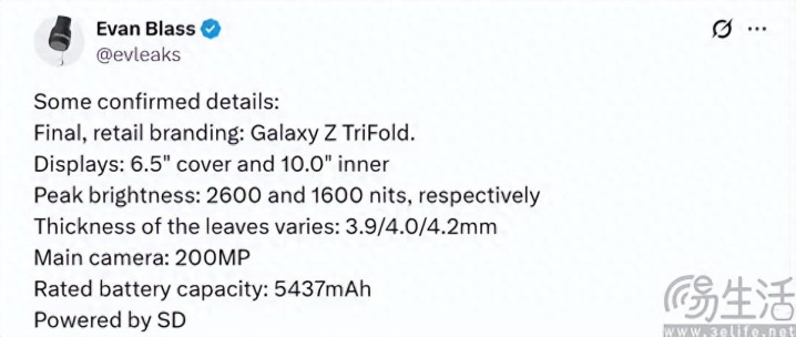 据悉,Galaxy Z TriFold或将采用一块峰值亮度可达2600nit的6.5英寸外屏,内屏展开后则能够获得高达10英寸的可视面积,其峰值亮度则为1600nit,预计将搭载定制的高通骁龙8至尊版主控,并有望提供5600mAh电池、支持45W有线快充。而在影像方面,这款机型则可能会配备Galaxy S25 Ultra同款的2亿像素主摄。