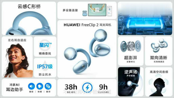 据何刚透露,今年1-7月,华为FreeClip耳机是国内千元以上耳机的出货量冠军,全新华为FreeClip 2耳夹耳机带来众多提升,定价1299元。